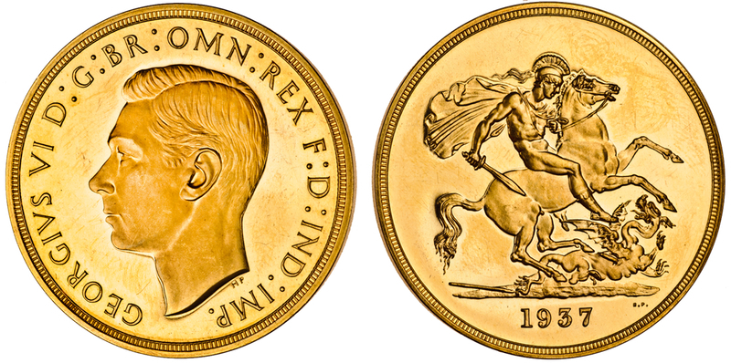 George VI (1936-52), proof Five-Pounds, 1937, head left, rev. St George and dragon (S.4074), a few light hairlines and slight rub on the highpoints on the obverse, otherwise brilliant uncirculated
