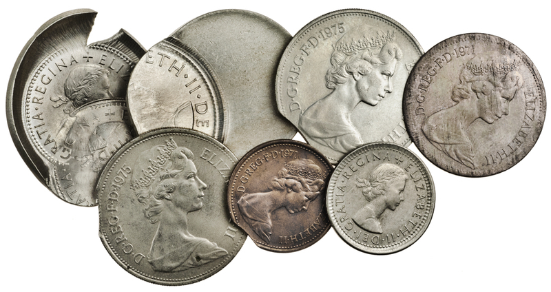 Elizabeth II, mis-strikes (7), Florin, two-thirds off-centre, date not visible, Shilling, 1964, double striking on a mis-shaped flan, Sixpence, 1966, struck without collar, 10 New Pence, 1975 (2), and One New Pence, 1971, all with indent in flan, 2 New Pence, 1971, struck without collar, very fine or better (6)
