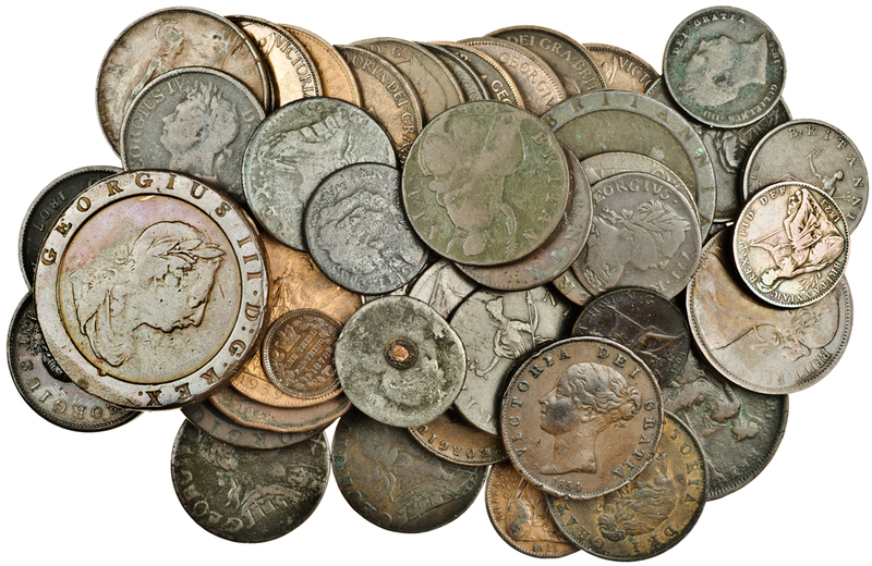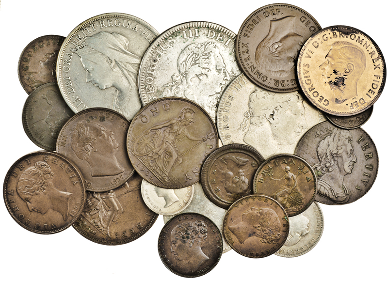 British milled coins (111), mainly eighteenth - twentieth century, Silver (34), including Crowns (6), Halfcrowns (5), Bank Tokens (3), Three Shillings 1814, One Shilling and Sixpence, 1811, this with attempted piercing, British Trade Dollar, 1900B, Maundy incomplete set (3), 1869, in old case, lacking Threepence, Florins (2), others, various denominations (14), Shilling, generally fair - fine, some better, AE (76), Twopence (2), Pennies (24), Halfpennies (24), Farthings (23), Farthing fractions (4), generally fair - fine, some better (111)
