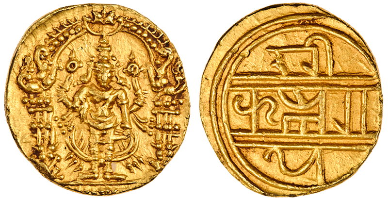 Vijayanagara, Krishnadevaraya (1509-30), AV presentation Double-Pagoda, 7.79g, Venkateshwara standing facing under arch ornamented with makaras, rev. Devanagari legend sri krishna raya (Elliot 1886, plate 3, 112; Ganesh and Girijapathy, Vijayanagar Empire, 1997, 9.1.1; MSI.I.1088), good extremely fine, almost as struck