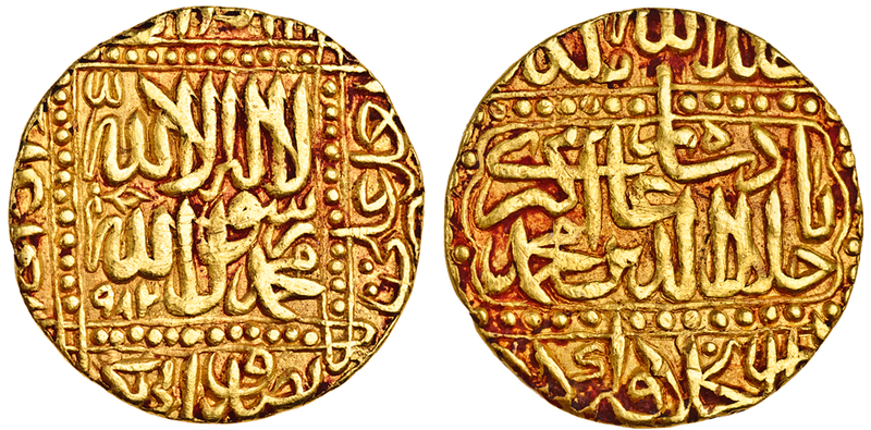 Mughal Empire, Akbar (1556-1605), AV Mohur, 10.79g, Dar ul-Khilafat Agra, AH982 (KM.108.1), very fine