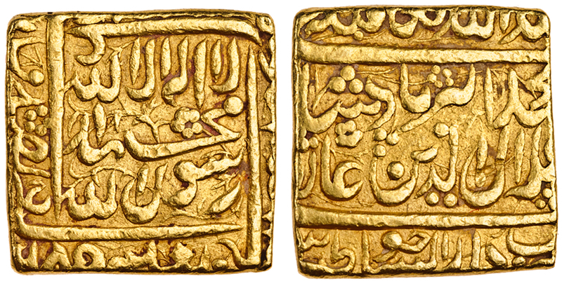 Mughal Empire, Akbar, square AV Mohur, 10.63g, Jaunpur, AH985, Kalima within square (cf. KM. 112), very fine