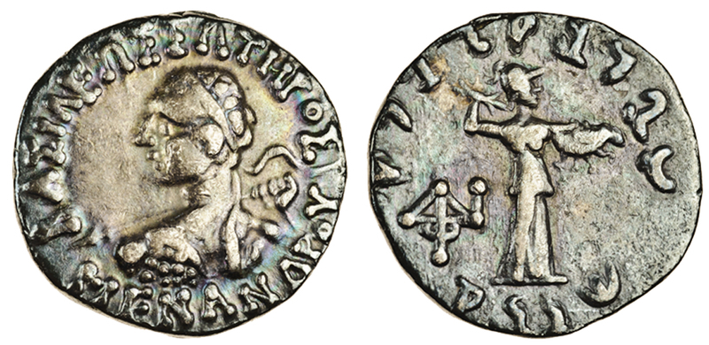 Indo-Greek, Menander (c.165-130 BC), Drachm, 2.43g, diademed bust left holding spear, rev. Athena right, holding thunderbolt, monogram left (M.1786), attractively toned, good very fine