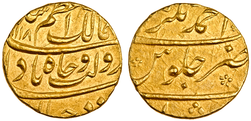 Mughal Empire, Azam Shah (rebel in Gujarat, Khandesh & Malwa, 1707), AV Mohur, 10.95g, Ahmadnagar, AH1118, yr.30 (KM.334.1), very fine, rare