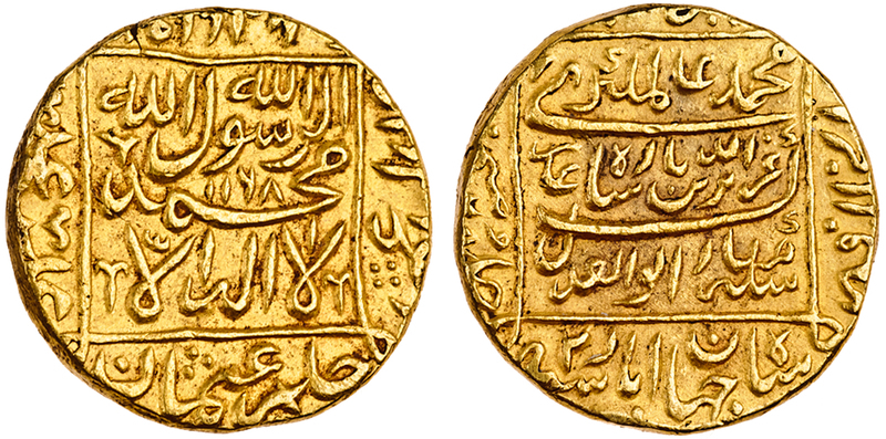 Mughal Empire, Alamgir II (1754-59), AV Mohur, 10.86g, Shahjahanabad, AH1168, ry.2, Kalima within square (BMC 1060; KM.464.1), good very fine, minor edge damage, scarce