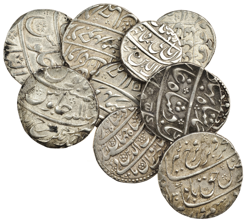 India, Mughal Empire, Shah Jahan, Rupees (4), “Sahib qirani”, Ahmadabad, AH1037, ry.1, Ilahi, Akbarnagir, AH1038, ry.2, Tir, Shajahanabad , AH1056, ry. 20, Patna, ry.16 (cf. KM.222.2, KM. 224.1, 227, 235.20), about very fine to very fine, Aurangzeb, Rupees, Itawa (2), AH1101, ry.33, AH1111, ry.45 (KM.300.39), very fine, Farrukhsiyar, Rupee, Surat, AH1130, ry.7 (KM.377.59), extremely fine, Muhammad Shah, Rupee, Gwalior, ry.10 (KM.436.25), very fine; Ahmad Shah, Rupee, Murshidabad, ry.1 (KM.446.15), very fine, Farrukhabad, in the name of Shah ´Alam II, Rupee, Ahmadnagar Farrukhabad, AH1183, ry.11 (KM.23), about very fine (10)