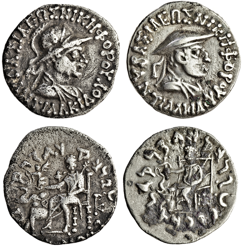 Indo-Greek, Antialcidas (c.115-95 BC), Drachms (2), 2.46g, bust right wearing kausia, 2.30g, helmeted bust, rev. Zeus Nikephoros (Bopearachchi Série 12, 13; SNG ANS 1058-1103; M.277, 279), very fine, about very fine (2)