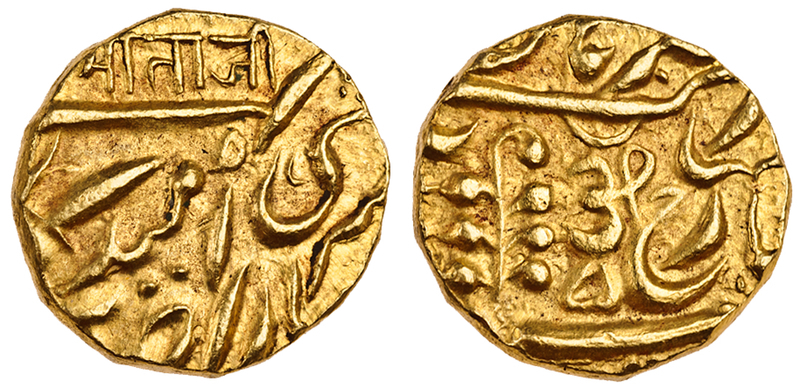 Indian States, Jodhpur, Umaid Singh with George V (1918-47), AV Mohur, 10.98g, Jodhpur, Devanagari legend above dagger, rev. Jhai leaf and letter ´Om,´ (KM.129), weakly struck, good very fine