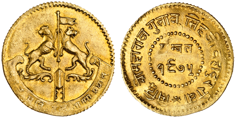 Indian States, Rewah, Gulab Singh (1918-46), Half-Mohur, 5.29g, VS 1975 (1918), commemorating the accession, two lions supporting a flag, rev. Devanagari legend (KM.33), unevenly struck, about extremely fine, rare