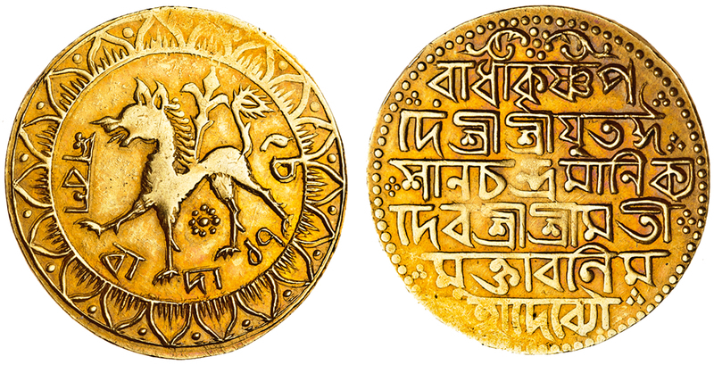 Indian States, Tripura, Isana Chandra Manikya (1849-62), AV Mohur, 10.89g, naming Queen Muktavali, SE1771 (1849) (Rhodes & Bhose 277, KM.343), unevenly worn, but generally very fine, scarce