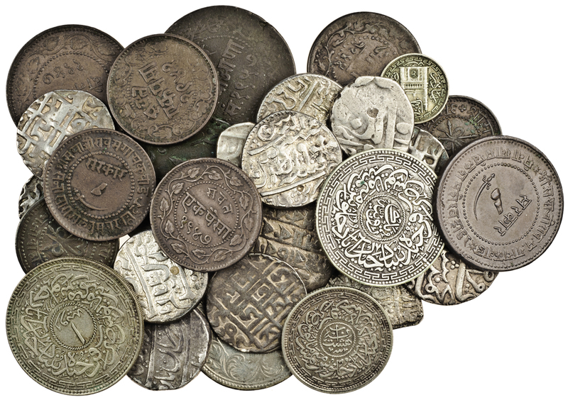Indian States, miscellaneous AR Coins (15), AE Coins (11), including issues of Assam, Baroda, Cooch Behar, Hyderabad, Indore, together Mughal Rupees (2) and Tokens (7), generally fine or better (35)