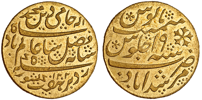 East India Company, Bengal Presidency, AV Mohur, 12.37g, Murshidabad (Calcutta), fixed date AH1202, ry.19 (Pr.62; KM.103), extremely fine