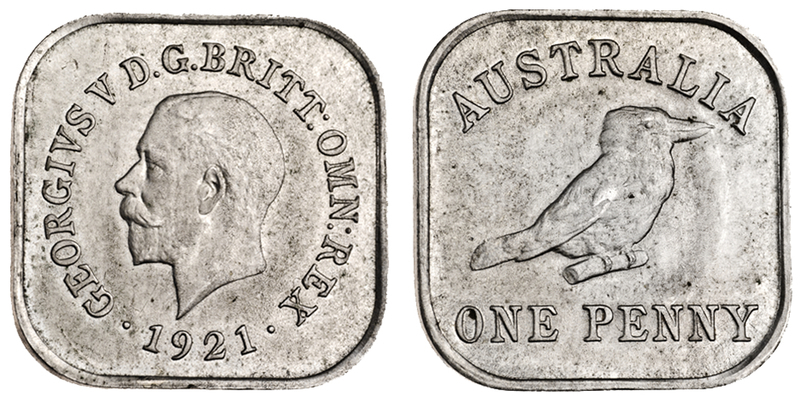 Australia, George V (1910-36), square cupro-nickel pattern Penny, 1921, by Sir Bertram Mackennal, small bare head left, rev. kookaburra right, on short thick diagonal branch (M.13; Ren.12), slight rub on high points, uncirculated, very rare
