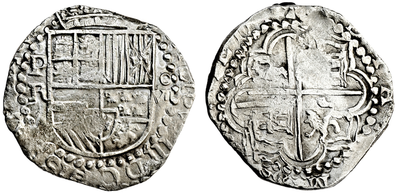 Bolivia, Philip III (1598-1621), Spanish colonial coinage, cob 8-Reales, 26.42g, Potosi, 1611-13, assayer R, crowned arms, rev. arms of Castille and Leon (C.4846; KM.10) a good example of a sea salvage coin, very fine