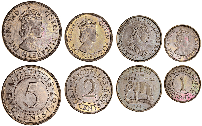 British Commonwealth coins (31), including British West Africa, Shilling (2), 1920 KN, 1940, Sixpence, 1938, Pennies (2), 1936 KN, 1951 KN, Halfpennies (2), 1951, 1952 KN, Tenth Pennies (2), 1945, 1954, Ceylon, Half-Stiver, 1815, Cent, 1940, Half-Cent (2), 1906, 1926, East Africa, 50-Cents (4), 1910, 1914 H, 1922, 1948, 10-Cents (2), 1910 H, 1952 H, 5-Cents, 1914 H, Cents (2), 1913, 1952 H, India, Cent, 1925b, Bikanir, Quarter-Anna, 1895, Dewas, Quarter-Anna, 1888, Mauritius, 5-Cents, 1967, 2-Cents, 1959, Cent (2), 1952, 1961, Straits Settlements, Quarter-Cent (2), 1905, 1916, average very fine to extremely fine (31)