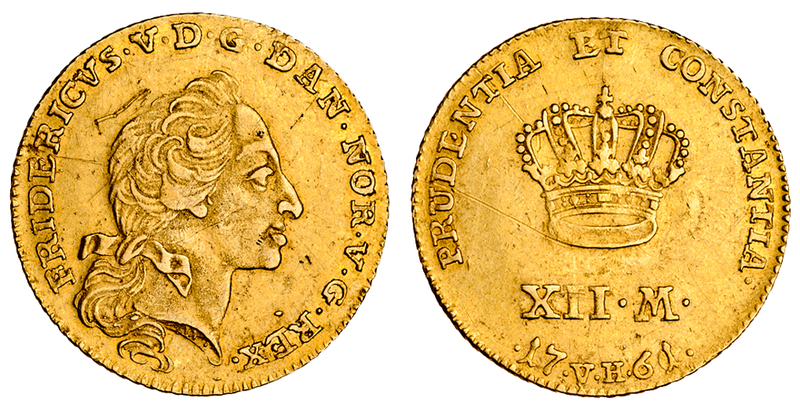 Denmark, Frederik V (1746-66), 12-Mark (Ducat courant), 1761, head right, rev. crown over value (F.269; KM.587.3), some scratches otherwise very fine