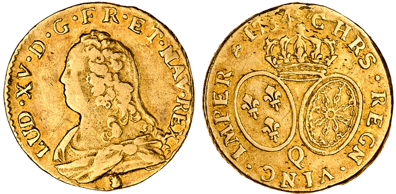 France, Louis XV, Louis d´or aux lunettes, 1734 Q, Perpignan, bust left, rev. crowned shields (Dup.1640; F.461; KM.489.17), from a mount, good fine