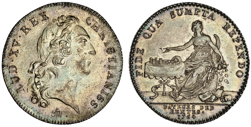 France, Louis XVI, silver jeton, Paris, officiers payeurs des rentes 1764, head right, rev. fide qua sumpta rependo, allegorical figure of Honesty, bags of coins at her feet, seated by a table covered with coins, and holding a cornucopia which also spills coins, 30mm. (F.3875), extremely fine