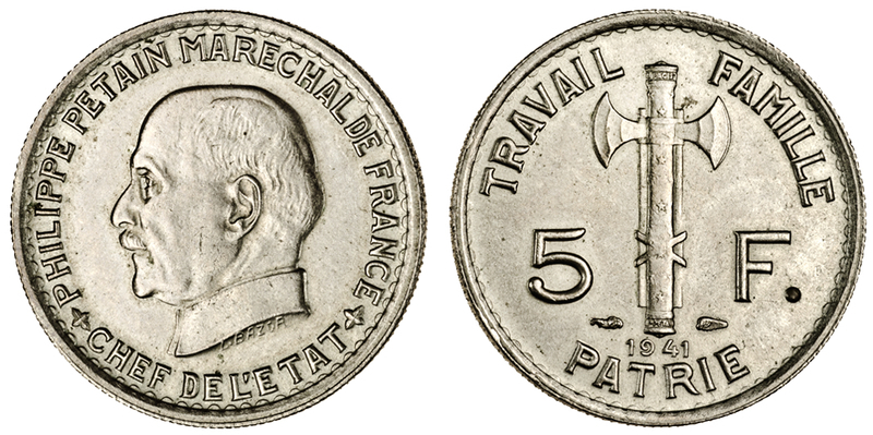 France, Vichy State (1940-44), 5-Francs, 1941, double headed axe, rev. bust of Maréchal Pétain left (KM.901), extremely fine