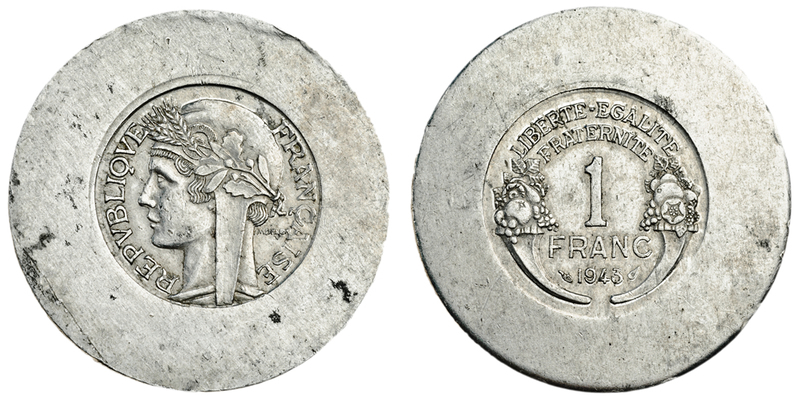 France, Free French State, trial strike aluminium Graziani Franc, 1943, on wide planchet, 37mm., head of Marianne left, rev. value between cornucopia, good very fine, extremely rare and historically interesting, possibly the third known
