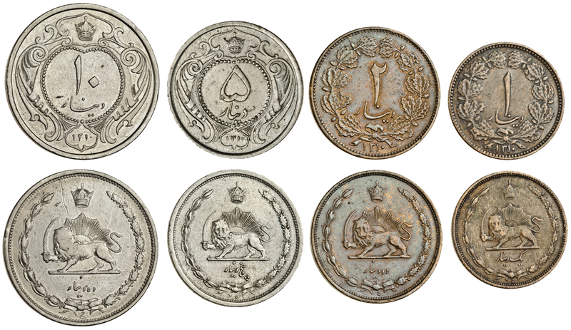 Iran, Pahlavi Dynasty, Reza Shah, reform coinage, CuNi. 10-Dinars, Cu.Ni. 5-Dinars, AE 2-Dinars, AE Dinar, all dated SH1310 (KM.1121, 1123, 1124), generally very fine, the 10-Dinars scratched on obverse, the 5-Dinars better, all scarce (4)
