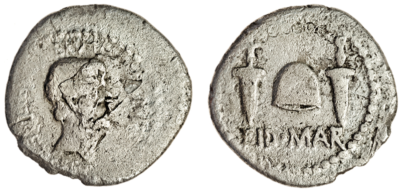Roman Imperatorial, Brutus, Denarius, 3.14g, mint in Western Asia Minor or Macedonia, 42 BC, bare head right, brvt [imp l plaet cest], rev. eid.mar, pileus (cap of Liberty) between two daggers (cf. Cahn, Quaderni Ticinesi xviii, 27a; RIC 1439; RRC 508/3; RSC 15), porous surfaces, metal flaw on face, fair / fine, a newly found example of this desirable issue, rare, especially so rare from British soil