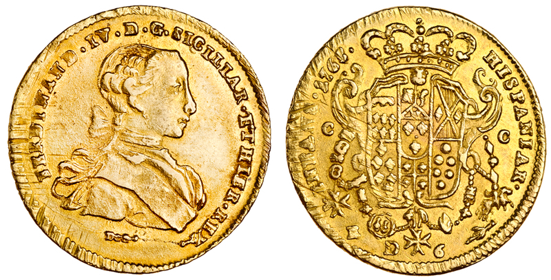 Italy, Naples, Ferdinand IV (1759-1825), 6-Ducati, 1765 DG / CC-R, bust right, rev. crowned arms (F.646a; KM.c75), ex mount very fine