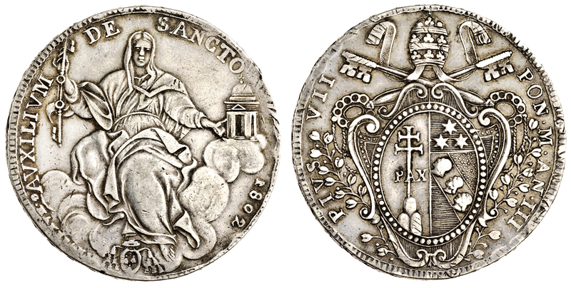 Italy, Papal States, Pius VII (1800-23), Scudo, 1802 IIIR, arms, rev. seated figure holding keys to left and church to right (KM.1249), very fine