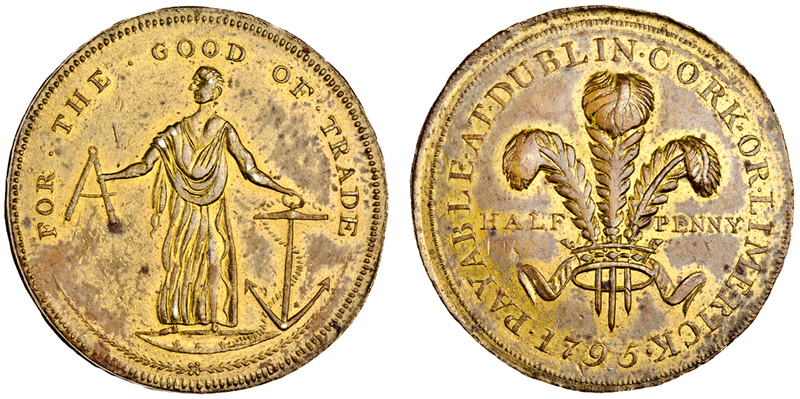 Dublin, Halfpenny, 1795, mule struck in brass, female standing with quadrant and anchor, for. the. good. of. trade, rev. Prince of Wales plumes, payable. at. dublin. cork. or. limerick (DH 320), lustrous, uncirculated, rare