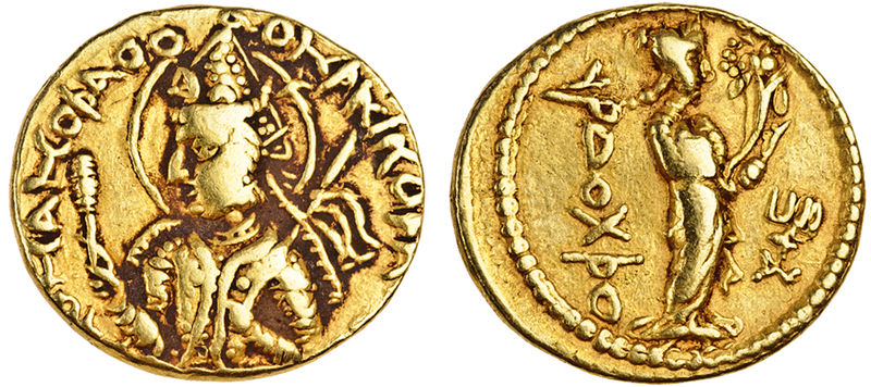 Kushan Empire, Huvishka, AV Dinar, 7.91g, nimbate bust of king left holding club, rev. goddess Ardoksho standing right holding cornucopia (Göbl 286), about very fine