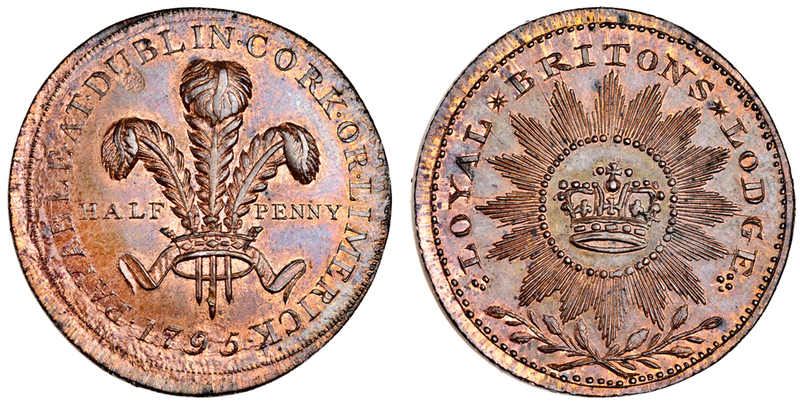 Dublin, Halfpenny, 1795, Prince of Wales plumes, payable. at. dublin. cork. or. limerick. around, rev. loyal britons lodge, radiate crown (DH 330), full lustre, uncirculated, rare
