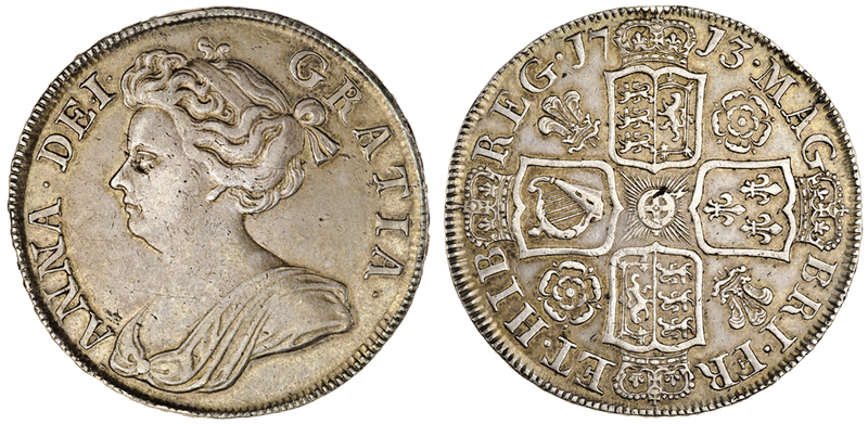 Anne, post-Union, Halfcrown, 1713 dvodecimo, draped bust left, rev. four crowned shields cruciform, roses and plumes in angles (ESC 584; S.3607), very fine