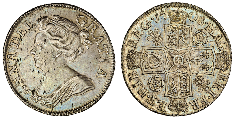 Anne, post-Union, Shilling, 1708, third draped bust left, rev. four crowned shields cruciform, roses and plumes in angles (ESC 1149; S.3614), toned, almost extremely fine