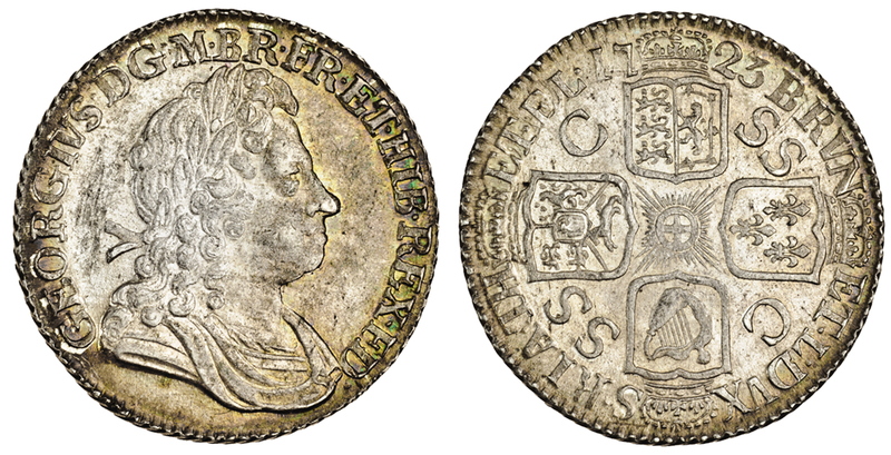 George I (1714-27), Shilling, 1723 ssc, first, laureate, cuirassed and draped bust right, rev. four crowned shields cruciform, ssc (ESC 1175; S.3647), mark behind bust, lustrous almost extremely fine