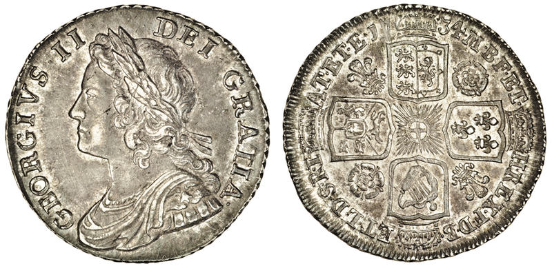 George II, young head Shilling, 1734, laureate, cuirassed and draped bust left, rev. four crowned shields cruciform, roses and plumes in angles (ESC 1197; S.3700), marks, good very fine