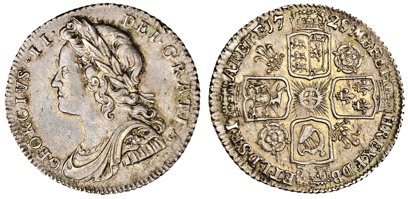 George II, young head Sixpence, 1728, laureate, cuirassed and draped bust left, rev. four crowned shields cruciform, roses and plumes in angles (ESC 1603; S.3707), toned, almost extremely fine