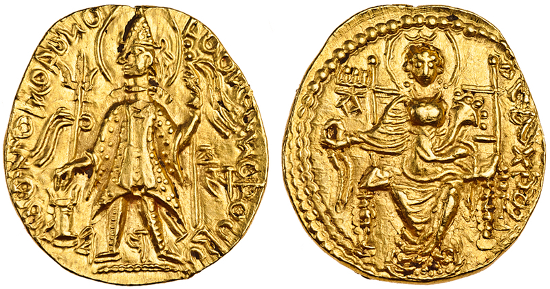 Kushan Empire, Vasu Deva III (c.360 -65), AV Dinar, 7.87g, king standing left with trident left and garlanded standard right, Vasu in field right, rev. Ardoksho seated facing (Göbl 569), extremely fine