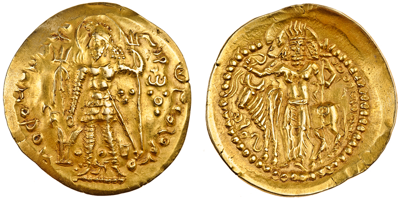 Kushano-Sasanian, Peroz (mid 4th century AD), Kabul, scyphate AV Dinar,7.85g, king standing left making offering at an altar and holding standard to right, with trident in left field, rev. Siva standing with bull Nandi, holding trident and noose (Göbl 703; Alram 1430), extremely fine