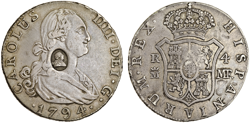 George III, emergency coinage, oval countermark on Spain, Madrid, Charles IV 4-Reales, Madrid, 1794, rev. crowned shield (ESC 611; S.3767), nearly very fine