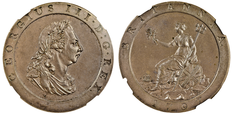 George III, Soho coinage, Penny, 1797, laureate, draped bust right, 10 leaves, rev. Britannia (Peck 1132; S.3777), in NGC holder graded MS 62 BN