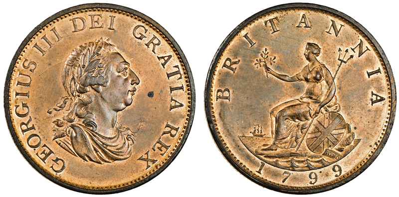 George III, Halfpenny, 1799, Soho mint, laureate, draped bust right, rev. Britannia seated left, five incuse gunports to ship (Peck 1248; S.3778), small spot in right field otherwise lightly toned with much lustre, extremely fine