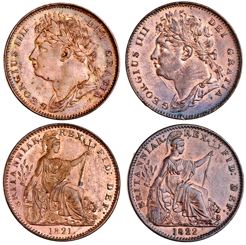 George IV, Farthings (3), first issue, 1821 (2), 1822 (Peck 1407, 1411; S.3822), uncirculated (3)