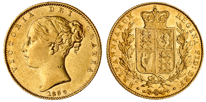 Victoria (1837-1901), young head Sovereign, 1839, rev. crowned shield in wreath (Marsh 23; S.3852), nearly very fine, rare