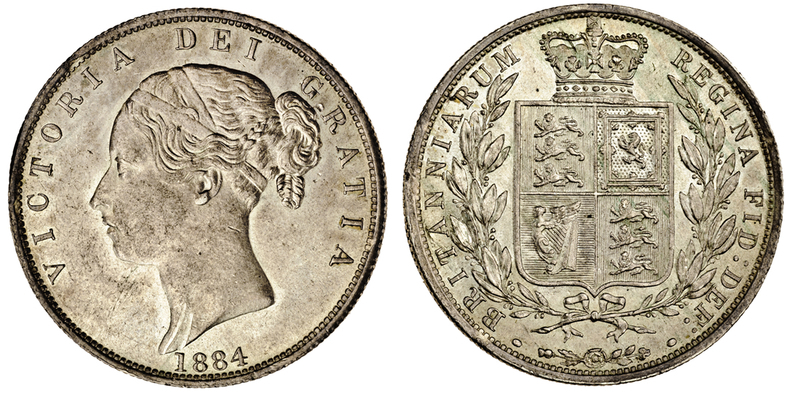 Victoria, young head Halfcrown, 1884, rev. crowned shield within wreath (ESC 712; S.3889), mark on breast and in field behind hair, nearly extremely fine