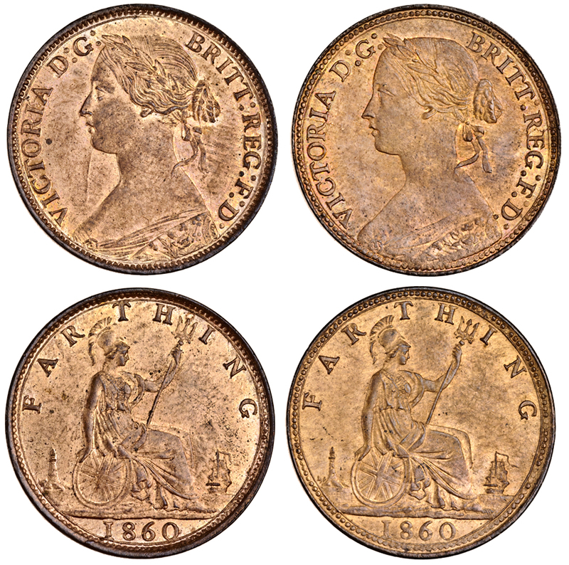 Victoria, ´bun´ head Farthings, 1860 (3), beaded border, toothed border (2) (Peck 1854, 1858, 1859; S.3958), extremely fine - uncirculated (3)