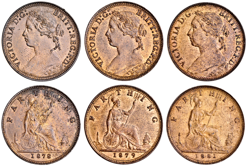 Victoria, ´bun´ head Farthings (5), 1875, 1878, 1879, 1880, 1881 (2), one Freeman obverse 6, the other Freeman obverse 5 (Peck 1891, 1896, 1898, 1902, 1902; S.3958), the 1879 uncirculated, the others generally extremely fine - almost uncirculated (6)