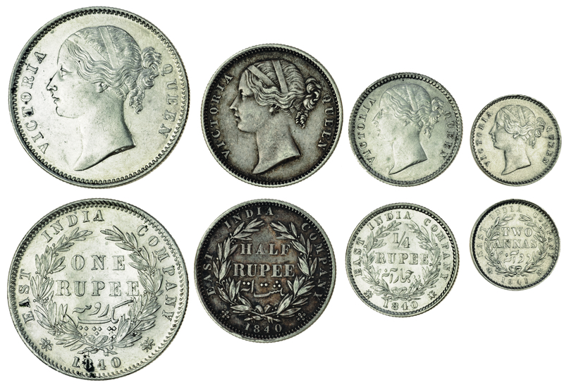 India, East India Company, Victoria, Rupee, Quarter-Rupee, 1840, 2-Annas, divided legend, 1841, all w.w. raised, Half-Rupee, 1840 .w.w incuse (S.W.3.33, 3.46, 3.52, 3.62; Pr.57, 80, 105, 121; KM.454.2, 458.2, 456.1, 460), the Rupee, Quarter-Rupee and 2-Annas extremely fine, the Half-Rupee very fine (4)