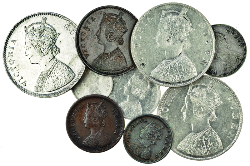 British India, Victoria, Rupees (3), Quarter-Rupees (2), 2-Anna, Quarter Anna, Half-Pice, 1/12-Anna, all 1862, various types, identified in envelopes (KM.465, 466, 467, 469, 470, 473.1), one Quarter-Rupee fine, others good very fine to extremely fine (9)