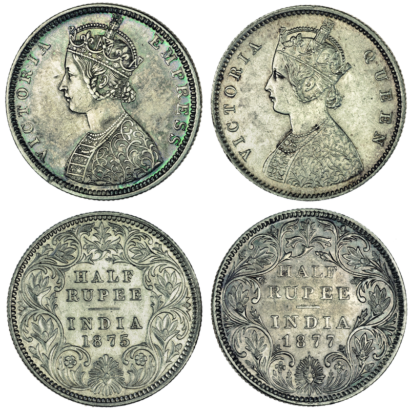 British India, Victoria, Half-Rupees (2), 1875, Calcutta, 1877, Bombay (S.W.5.25, 6.172; Pr.260, 288; KM 472, 491), the first about extremely fine, the second good very fine, scarce (2)