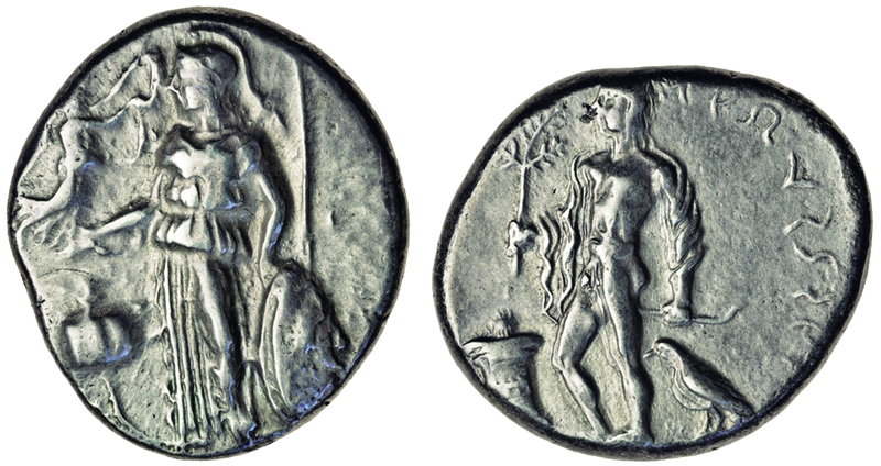 Pamphylia, Side (c.380-360 BC), AR Stater, 10.51g, Athena standing left, holding Nike and leaning left hand on shield at her side, behind which is a spear, pomegranate on left, rev. Pamphylian script, Apollo standing left before altar, holding branch and bow, eagle standing left on right (cf SNG France 634; Atlan -), very fine